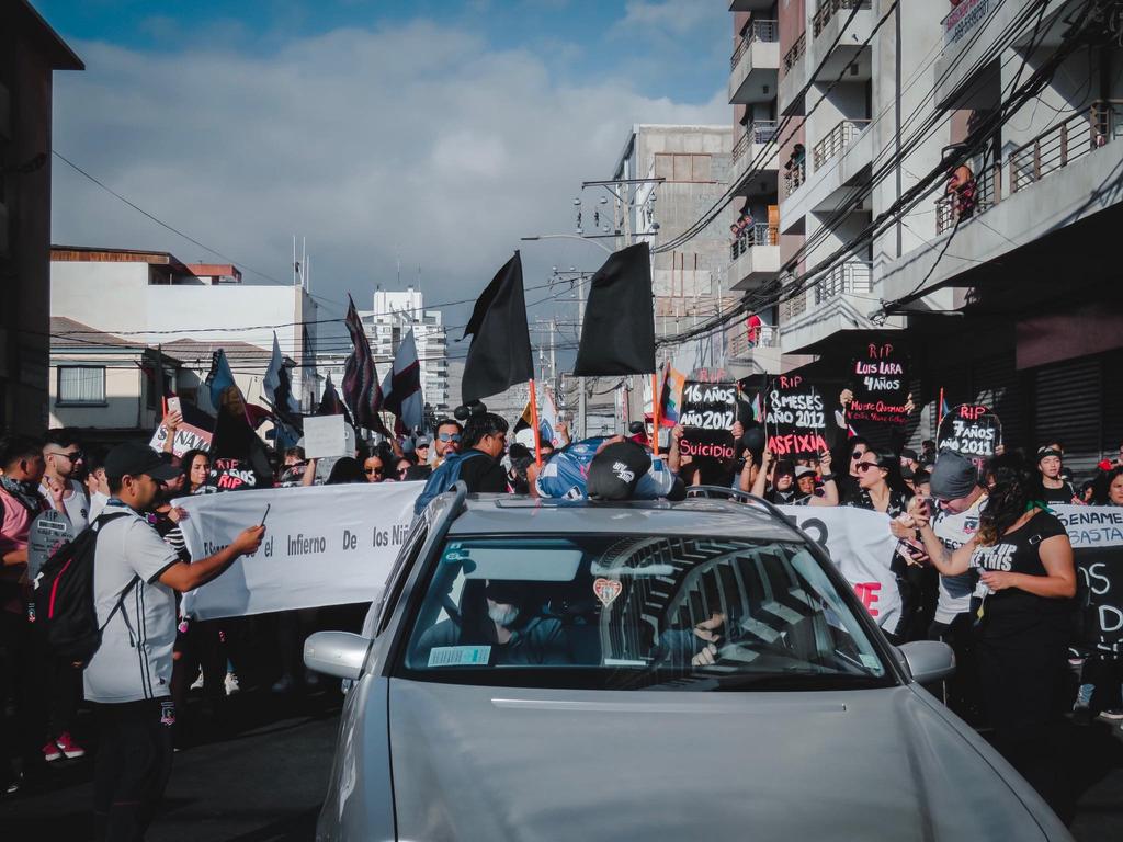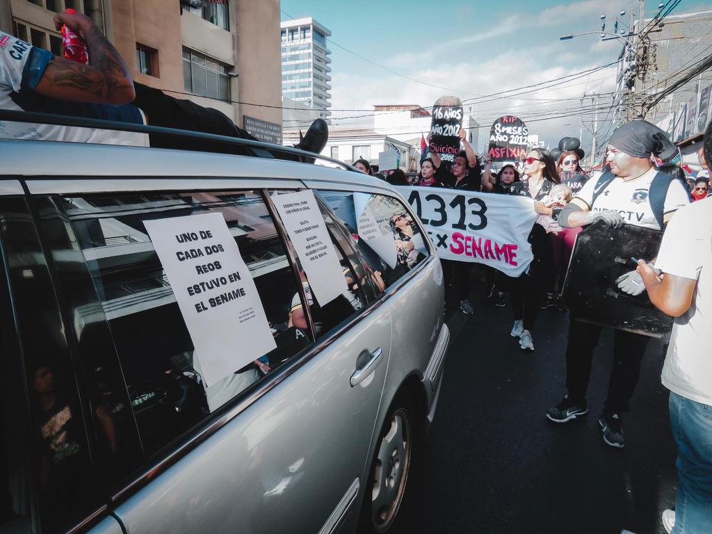 Una carroza fúnebre, junto a distintos carteles, fue la que lideró la protesta por las distintas muertes de niños y adolescentes que han ocurrido dentro del organismo estatal, que opera en base a distintas fundaciones privadas.