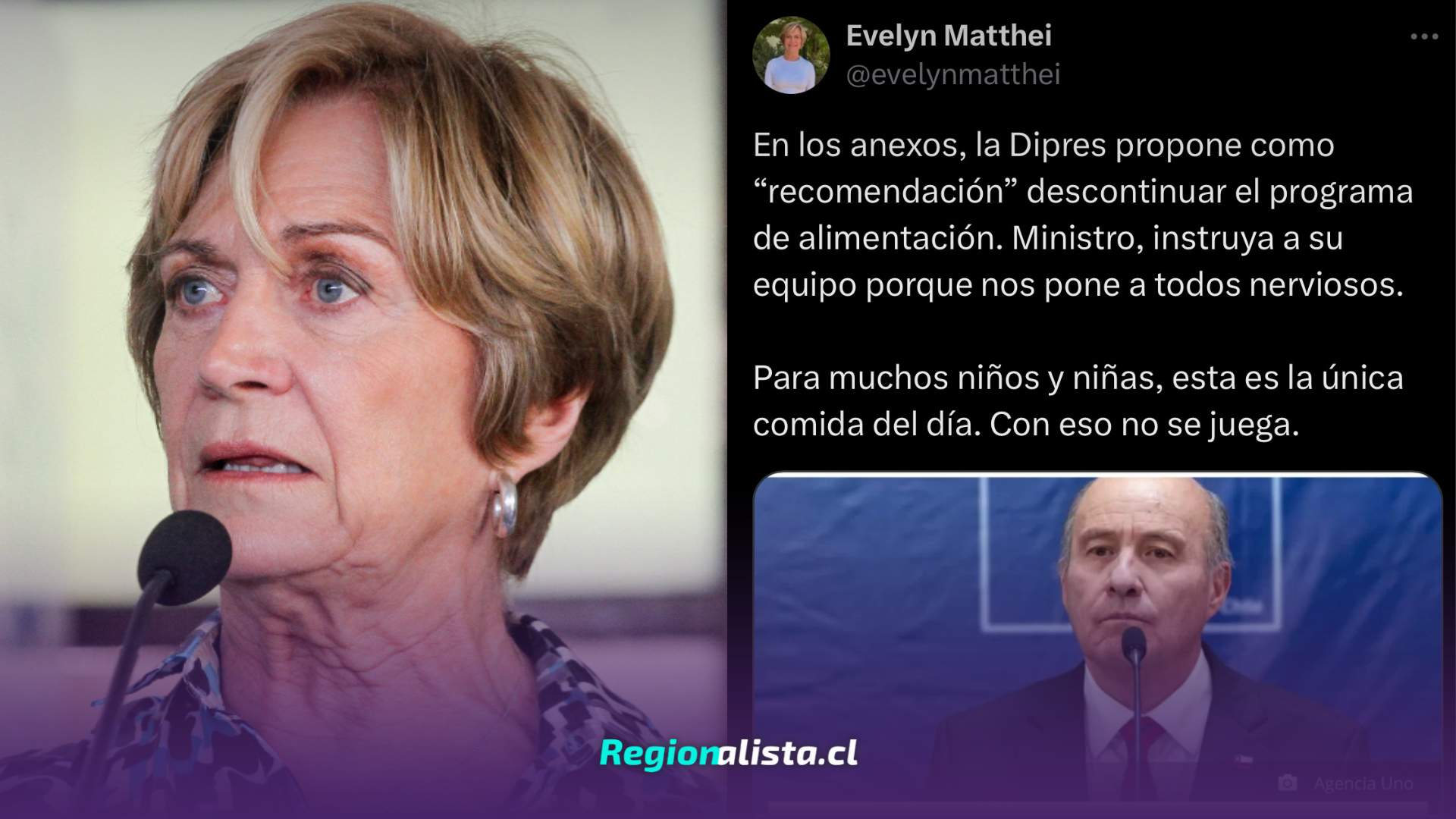 Evelyn Matthei criticó la propuesta de recorte a programas del Ministerio de Educación, luego de que un documento del Ministerio de Hacienda planteara ajustes a la oferta programática, incluyendo iniciativas vinculadas a la alimentación escolar.